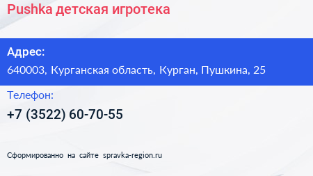 Pushka, детская игротека по адресу 640003, Курганская область, Курган, Пушкина, 25 в дальнейшем Организация, размещена в следующих категориях: