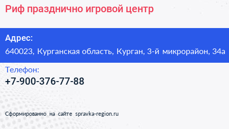 Риф, празднично-игровой центр по адресу 640023, Курганская область, Курган, 3-й микрорайон, 34а в дальнейшем Организация, размещена в следующих категориях: