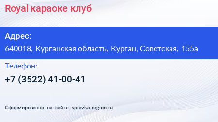 Royal, караоке-клуб по адресу 640018, Курганская область, Курган, Советская, 155а в дальнейшем Организация, размещена в следующих категориях: