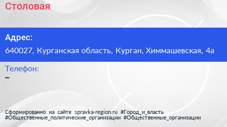 Столовая по адресу 640027, Курганская область, Курган, Химмашевская, 4а в дальнейшем Организация, размещена в следующих категориях: