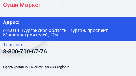 Суши-Маркет по адресу 640014, Курганская область, Курган, проспект Машиностроителей, 40а в дальнейшем Организация, размещена в следующих категориях: