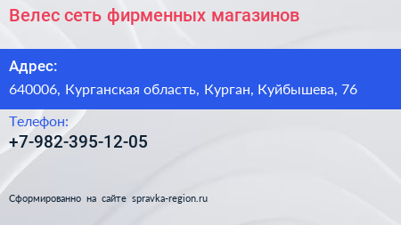 Велес, сеть фирменных магазинов по адресу 640006, Курганская область, Курган, Куйбышева, 76 в дальнейшем Организация, размещена в следующих категориях: