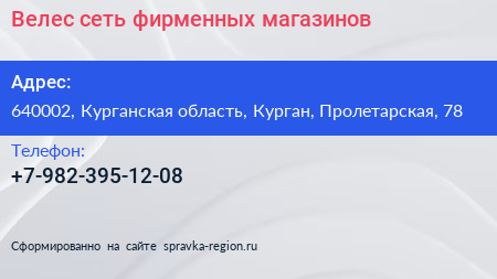Велес, сеть фирменных магазинов по адресу 640002, Курганская область, Курган, Пролетарская, 78 в дальнейшем Организация, размещена в следующих категориях: