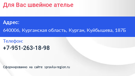Для Вас, швейное ателье по адресу 640006, Курганская область, Курган, Куйбышева, 187Б в дальнейшем Организация, размещена в следующих категориях: