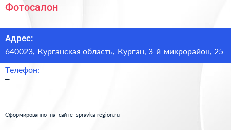Фотосалон по адресу 640023, Курганская область, Курган, 3-й микрорайон, 25 в дальнейшем Организация, размещена в следующих категориях: