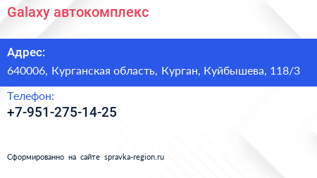 Galaxy, автокомплекс по адресу 640006, Курганская область, Курган, Куйбышева, 118/3 в дальнейшем Организация, размещена в следующих категориях: