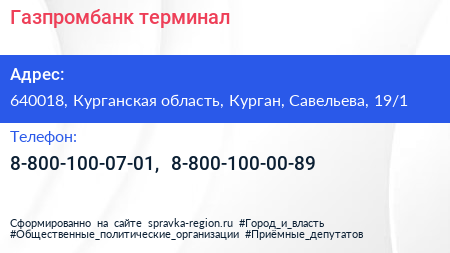 Газпромбанк, терминал по адресу 640018, Курганская область, Курган, Савельева, 19/1 в дальнейшем Организация, размещена в следующих категориях: