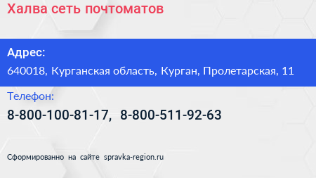 Халва, сеть почтоматов по адресу 640018, Курганская область, Курган, Пролетарская, 11 в дальнейшем Организация, размещена в следующих категориях: