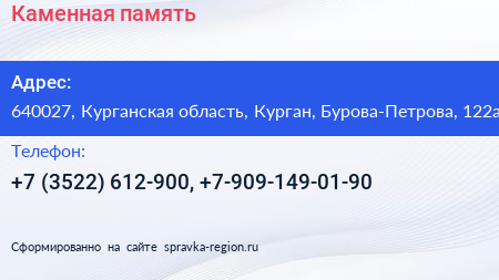 Каменная память по адресу 640027, Курганская область, Курган, Бурова-Петрова, 122а в дальнейшем Организация, размещена в следующих категориях: