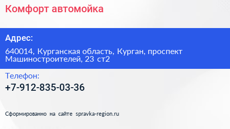 Комфорт, автомойка по адресу 640014, Курганская область, Курган, проспект Машиностроителей, 23 ст2 в дальнейшем Организация, размещена в следующих категориях: