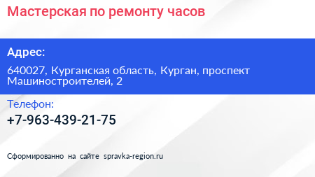 Мастерская по ремонту часов по адресу 640027, Курганская область, Курган, проспект Машиностроителей, 2 в дальнейшем Организация, размещена в следующих категориях:
