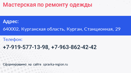 Мастерская по ремонту одежды по адресу 640002, Курганская область, Курган, Станционная, 29 в дальнейшем Организация, размещена в следующих категориях: