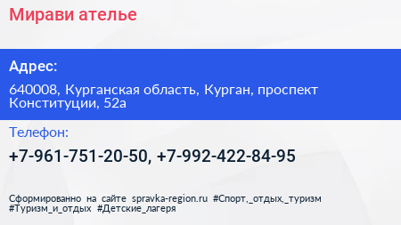 Мирави, ателье по адресу 640008, Курганская область, Курган, проспект Конституции, 52а в дальнейшем Организация, размещена в следующих категориях: