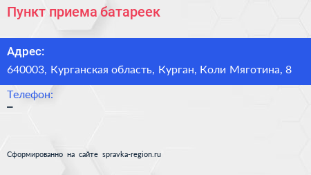Пункт приема батареек по адресу 640003, Курганская область, Курган, Коли Мяготина, 8 в дальнейшем Организация, размещена в следующих категориях:
