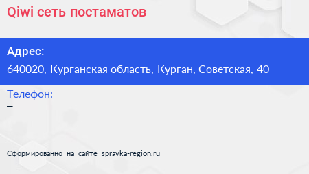 Qiwi, сеть постаматов по адресу 640020, Курганская область, Курган, Советская, 40 в дальнейшем Организация, размещена в следующих категориях: