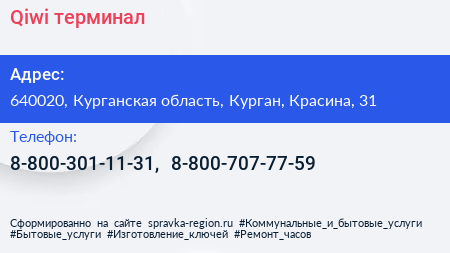 Qiwi, терминал по адресу 640020, Курганская область, Курган, Красина, 31 в дальнейшем Организация, размещена в следующих категориях: