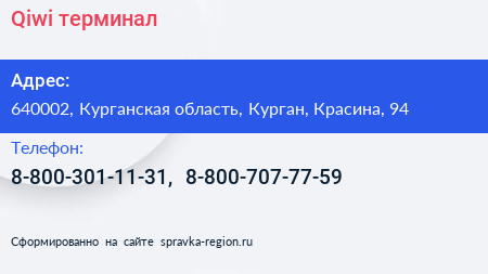 Qiwi, терминал по адресу 640002, Курганская область, Курган, Красина, 94 в дальнейшем Организация, размещена в следующих категориях: