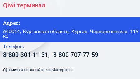 Qiwi, терминал по адресу 640014, Курганская область, Курган, Чернореченская, 119 к1 в дальнейшем Организация, размещена в следующих категориях: