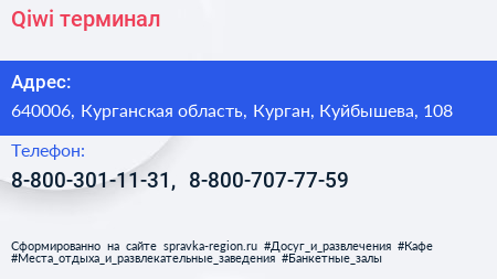 Qiwi, терминал по адресу 640006, Курганская область, Курган, Куйбышева, 108 в дальнейшем Организация, размещена в следующих категориях: