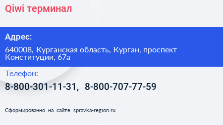 Qiwi, терминал по адресу 640008, Курганская область, Курган, проспект Конституции, 67а в дальнейшем Организация, размещена в следующих категориях: