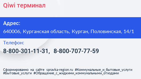 Qiwi, терминал по адресу 640006, Курганская область, Курган, Половинская, 14/1 в дальнейшем Организация, размещена в следующих категориях: