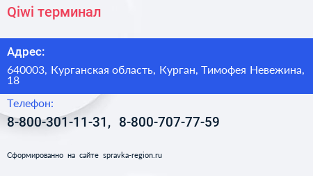 Qiwi, терминал по адресу 640003, Курганская область, Курган, Тимофея Невежина, 18 в дальнейшем Организация, размещена в следующих категориях: