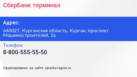 СберБанк, терминал по адресу 640027, Курганская область, Курган, проспект Машиностроителей, 2а в дальнейшем Организация, размещена в следующих категориях: