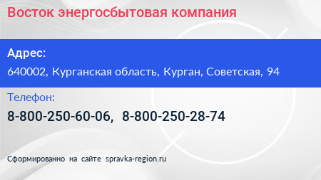 Восток, энергосбытовая компания по адресу 640002, Курганская область, Курган, Советская, 94 в дальнейшем Организация, размещена в следующих категориях: