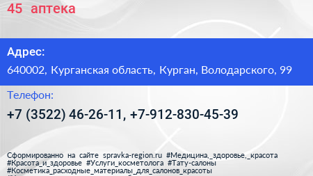 45+, аптека по адресу 640002, Курганская область, Курган, Володарского, 99 в дальнейшем Организация, размещена в следующих категориях: