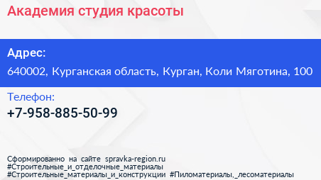 Академия, студия красоты по адресу 640002, Курганская область, Курган, Коли Мяготина, 100 в дальнейшем Организация, размещена в следующих категориях: