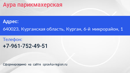 Аура, парикмахерская по адресу 640023, Курганская область, Курган, 6-й микрорайон, 1 в дальнейшем Организация, размещена в следующих категориях: