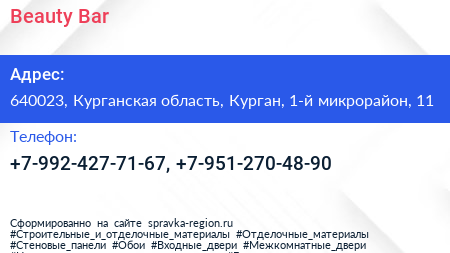 Beauty Bar по адресу 640023, Курганская область, Курган, 1-й микрорайон, 11 в дальнейшем Организация, размещена в следующих категориях: