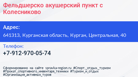 Фельдшерско-акушерский пункт, с. Колесниково по адресу 641313, Курганская область, Курган, Центральная, 40 в дальнейшем Организация, размещена в следующих категориях: