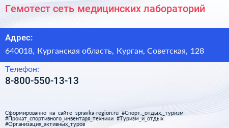 Гемотест, сеть медицинских лабораторий по адресу 640018, Курганская область, Курган, Советская, 128 в дальнейшем Организация, размещена в следующих категориях: