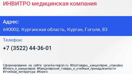 ИНВИТРО, медицинская компания по адресу 640002, Курганская область, Курган, Гоголя, 83 в дальнейшем Организация, размещена в следующих категориях: