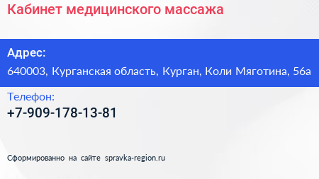 Кабинет медицинского массажа по адресу 640003, Курганская область, Курган, Коли Мяготина, 56а в дальнейшем Организация, размещена в следующих категориях: