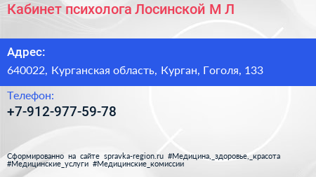 Кабинет психолога Лосинской М.Л. по адресу 640022, Курганская область, Курган, Гоголя, 133 в дальнейшем Организация, размещена в следующих категориях: