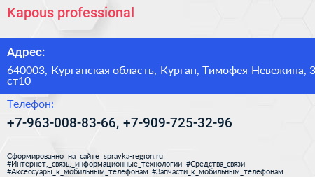Kapous professional по адресу 640003, Курганская область, Курган, Тимофея Невежина, 3 ст10 в дальнейшем Организация, размещена в следующих категориях:
