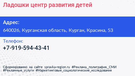 Ладошки, центр развития детей по адресу 640026, Курганская область, Курган, Красина, 53 в дальнейшем Организация, размещена в следующих категориях: