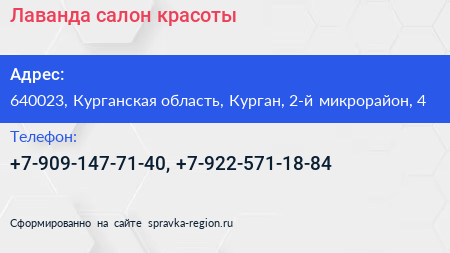 Лаванда, салон красоты по адресу 640023, Курганская область, Курган, 2-й микрорайон, 4 в дальнейшем Организация, размещена в следующих категориях: