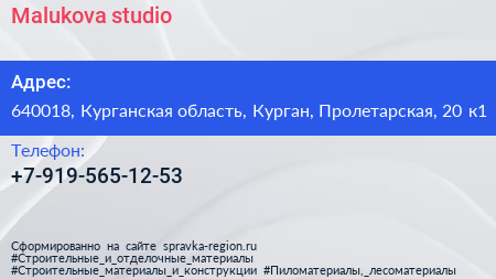 Malukova studio по адресу 640018, Курганская область, Курган, Пролетарская, 20 к1 в дальнейшем Организация, размещена в следующих категориях: