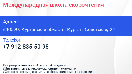 Международная школа скорочтения по адресу 640020, Курганская область, Курган, Советская, 24 в дальнейшем Организация, размещена в следующих категориях: