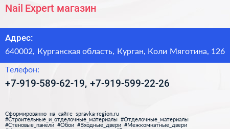 Nail Expert, магазин по адресу 640002, Курганская область, Курган, Коли Мяготина, 126 в дальнейшем Организация, размещена в следующих категориях: