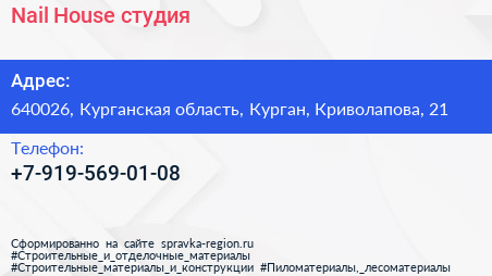 Nail House, студия по адресу 640026, Курганская область, Курган, Криволапова, 21 в дальнейшем Организация, размещена в следующих категориях: