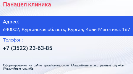 Панацея, клиника по адресу 640002, Курганская область, Курган, Коли Мяготина, 167 в дальнейшем Организация, размещена в следующих категориях: