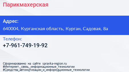 Парикмахерская по адресу 640004, Курганская область, Курган, Садовая, 8а в дальнейшем Организация, размещена в следующих категориях: