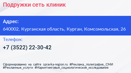 Подружки, сеть клиник по адресу 640002, Курганская область, Курган, Комсомольская, 26 в дальнейшем Организация, размещена в следующих категориях: