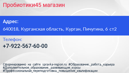 Пробиотики45, магазин по адресу 640018, Курганская область, Курган, Пичугина, 6 ст2 в дальнейшем Организация, размещена в следующих категориях: