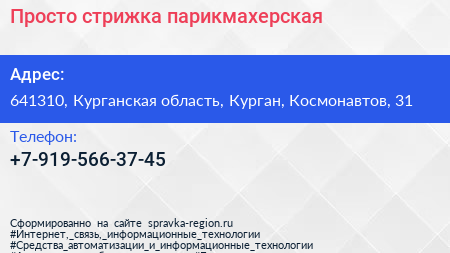 Просто стрижка, парикмахерская по адресу 641310, Курганская область, Курган, Космонавтов, 31 в дальнейшем Организация, размещена в следующих категориях: