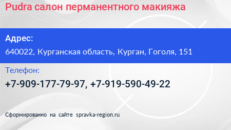 Pudra, салон перманентного макияжа по адресу 640022, Курганская область, Курган, Гоголя, 151 в дальнейшем Организация, размещена в следующих категориях: